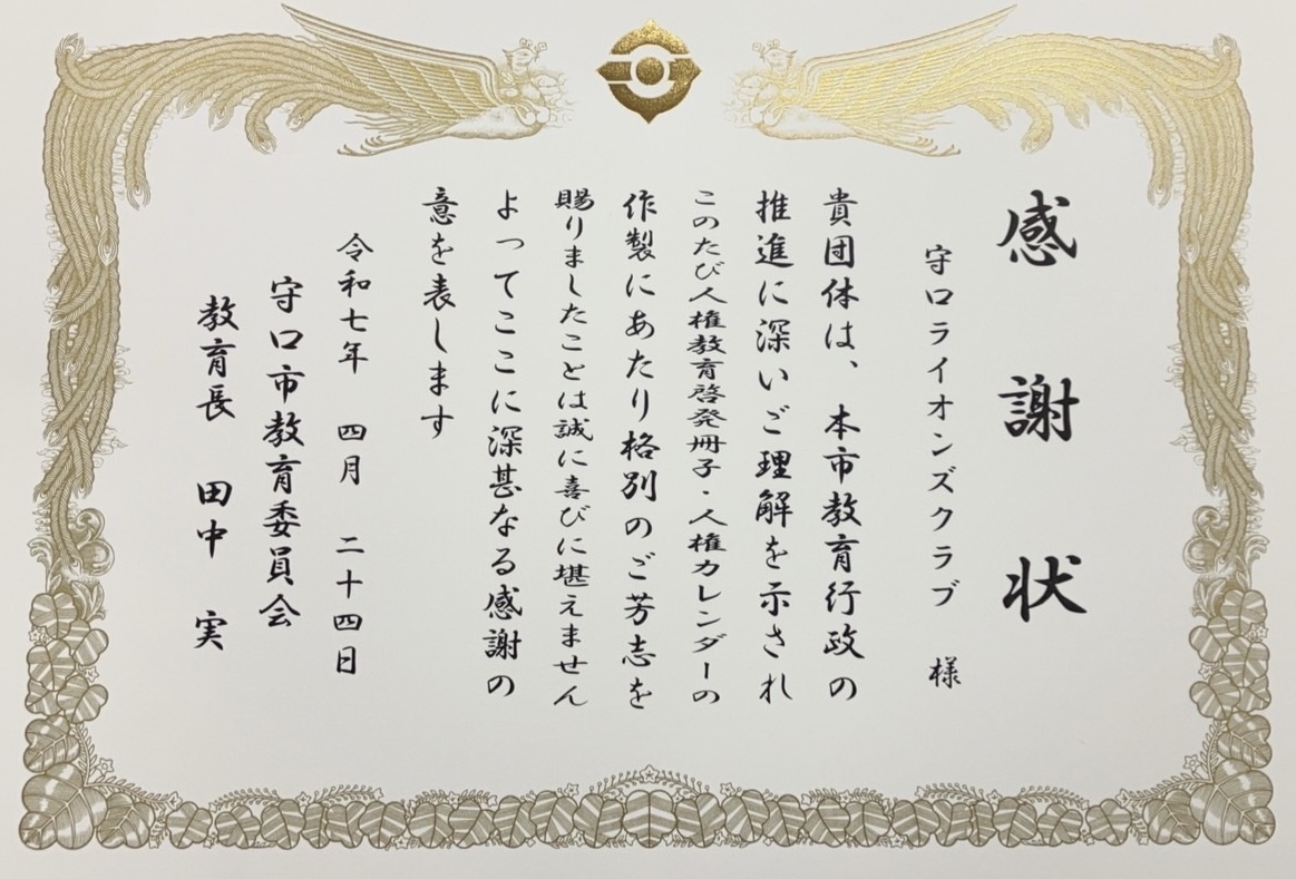 守口市教育委員会より感謝状